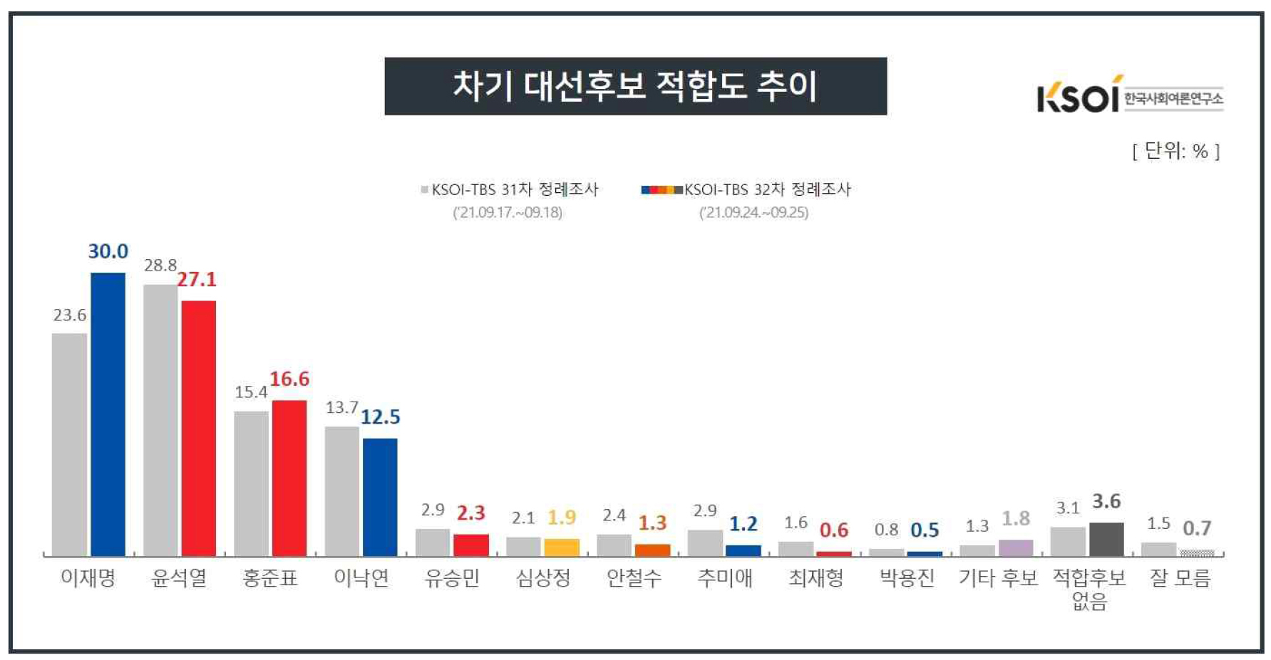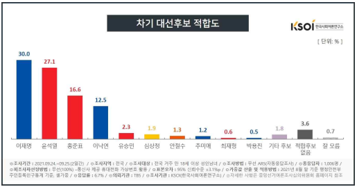 [디지털강원] TBS 의뢰로 한국사회여론연구소(KSOI)가 9월 24~25일 실시한 정기 주례조사 <차기 대선후보 적합도>에서, 지난 주 조사(9월 17~18일) 대비 이재명 예비후보(이하 후보로 표기) 는 6.4%p 상승한 30.0%, 윤석열 후보는 1.7%p 하락한 27.1%로 집계되 어, 이재명 후보가 9월 10~11일 조사 이후 2주만에 윤 후보를 오차범위 내에서 다시 앞서는 것으로 조사됐다(후보간 격차는 2.9%p).