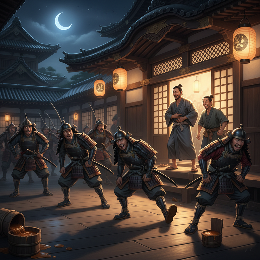 어느 날 밤, 진자에몬은 근무 중 잠든 경비병들에게 장난을 치기로 결심했습니다.