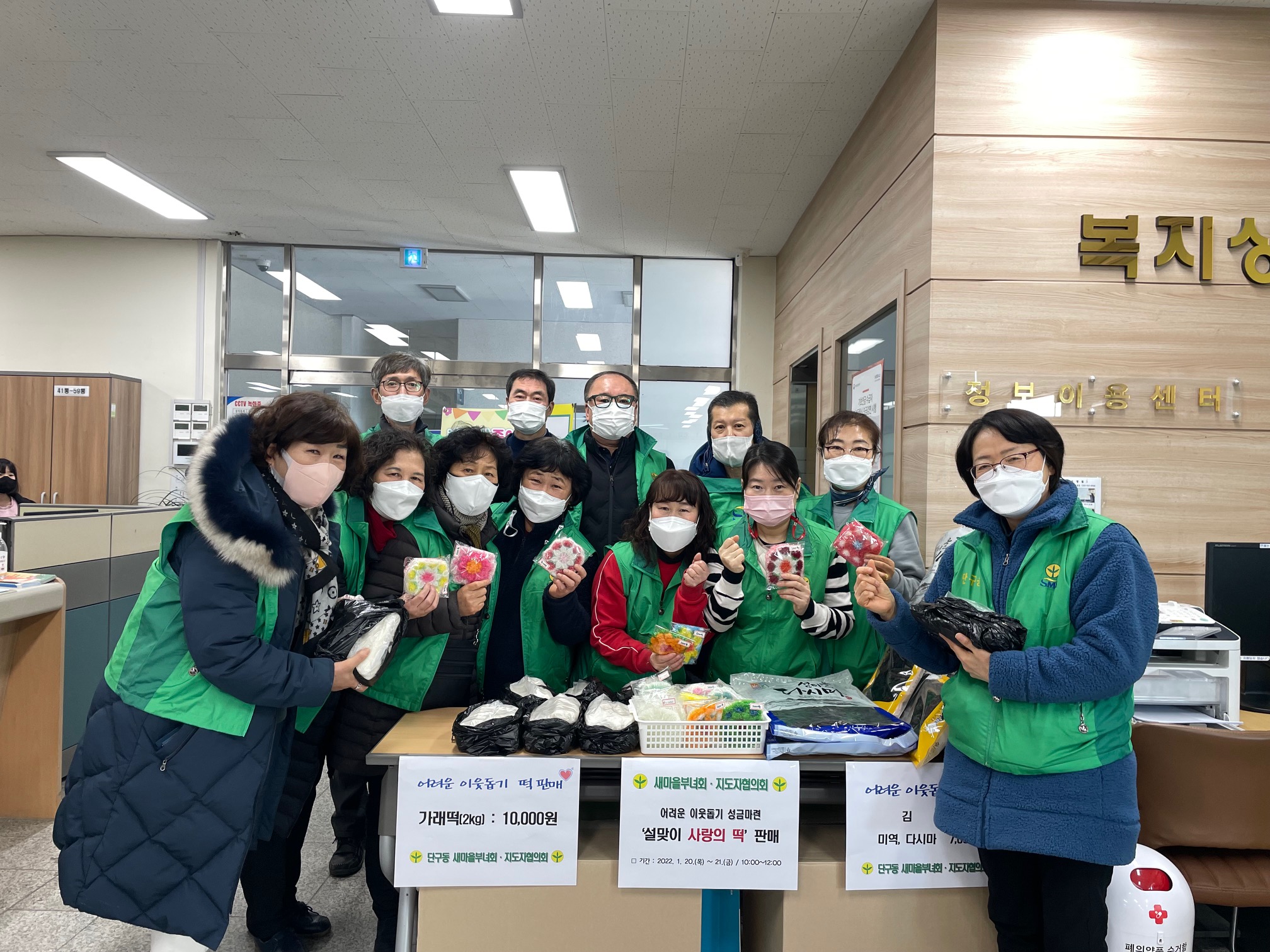 [디지털강원] 원주시 단구동 새마을부녀회(회장 우명옥)와 새마을지도자협의회(회장 김진한)는 지난 20일부터 이틀간 단구동 행정복지센터에서 가래떡과 김, 미역, 손수 뜬 수세미 등을 판매해 이웃돕기 성금을 마련했다.