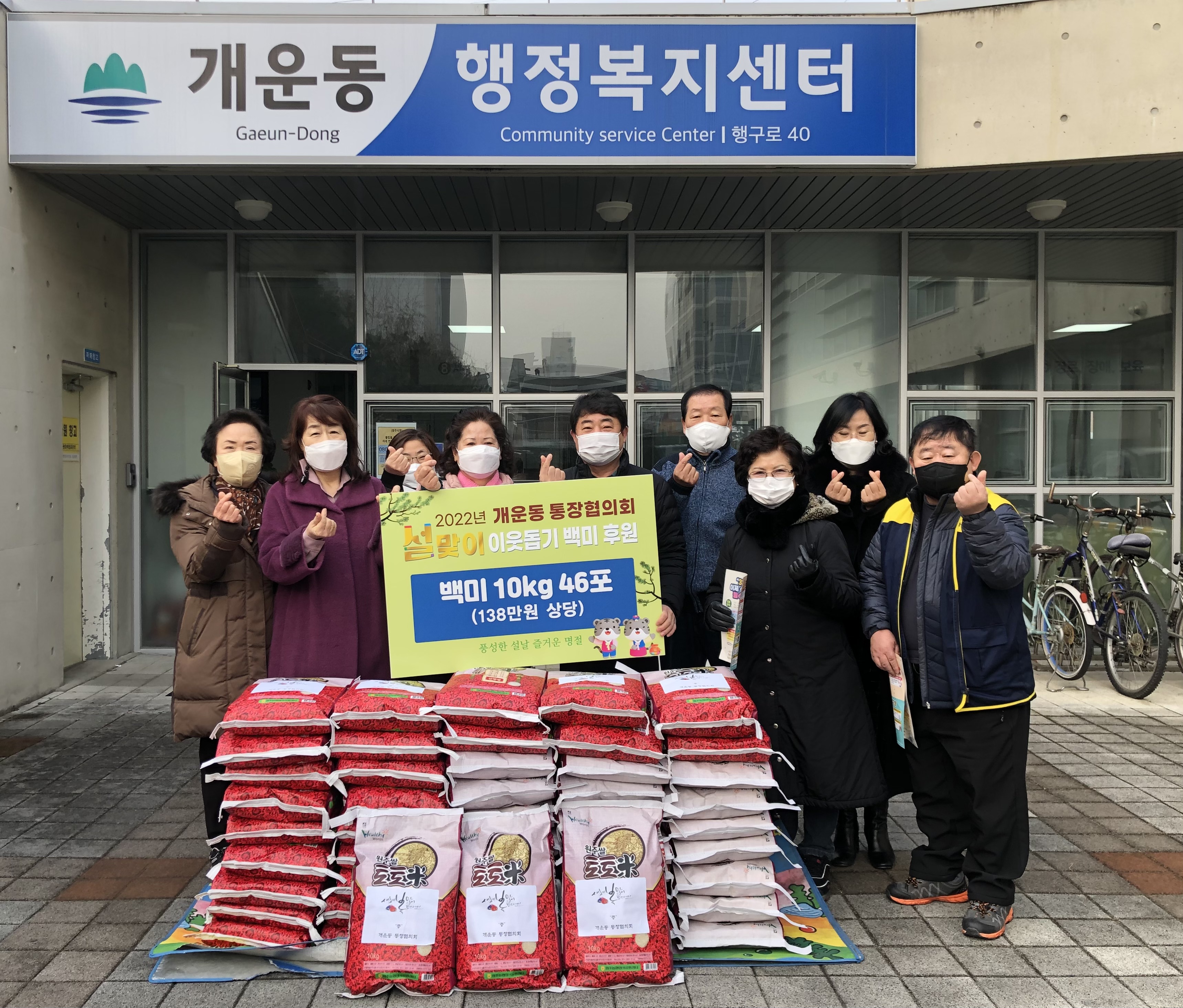 개운동통장협의회는 작년 3월부터 코로나19 예방과 안전한 개운동을 위해 적극적인 마을방역관 활동을 펼쳐 우수마을방역단 최우수상을 받았으며, 이에 더해 지역의 어려운 이웃을 위해 성금을 모아 쌀을 마련하게 됐다.