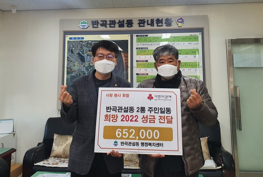 [디지털강원] 반곡관설동 2통 주민 일동(통장 김용균)은 지난 달 28일 반곡관설동 행정복지센터를 방문해 희망2022나눔캠페인 성금 65만 2천 원을 전달했다.